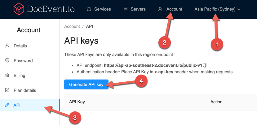 Select the region that you wish to generate your API key in, and create a new API key.
